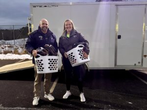 Pictured above – University of Maine’s Head Baseball Coach, Nick Derba and AYCC’s Athletic Director, Beth LaFountain pose with baskets full of donated baseball & softball gloves for UMaine’s Gloves for Good campaign.